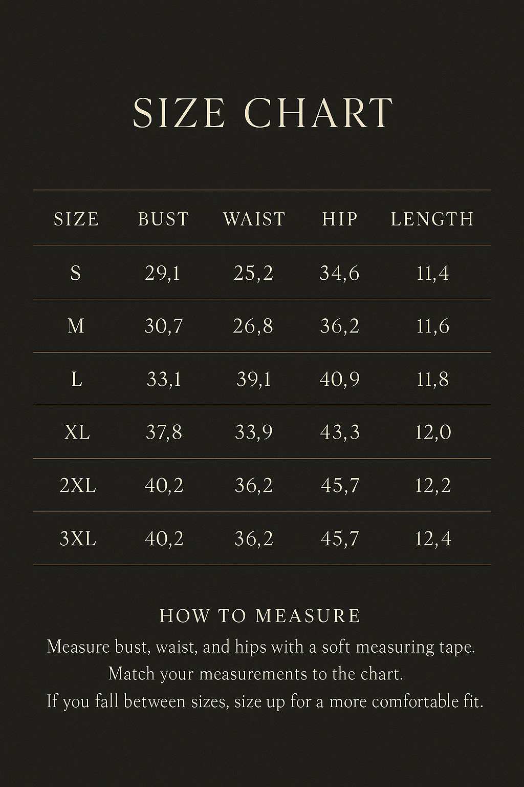 All our pieces are designed with comfort, quality, and style in mind. Each product is crafted from premium materials, carefully selected to deliver long-lasting wear and a flattering fit. Please refer to the size chart provided on each product page before placing your order to ensure the best fit.